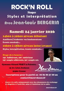Stage de Rock le 24/01/2026 au gymnase La palestre avec Jean-Louis suivit de la soirée dansante galette à l’école Joliot Curie (inscription obligatoire).